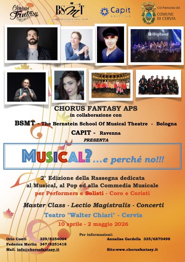 Sono aperte le iscrizioni alle Masterclass per Performer e Solisti - Coro e Coristi organizzate dall’Associazione Chorus Fantasy Aps di Ravenna, in collaborazione con la prestigiosa BSMT – Bernstein School of Musical Theater di Bologna e con Capit Ravenna.
