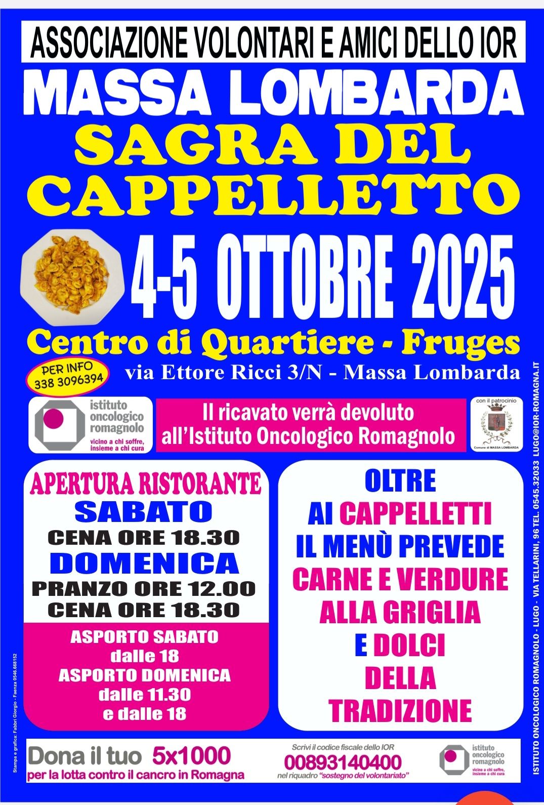 Sabato 4 e domenica 5 ottobre a Massa Lombarda torna la Sagra del Cappelletto Autunnale, in programma presso il Centro di Quartiere – Fruges di via IV Novembre. L’evento, organizzato da oltre quaranta volontari, unisce tradizione gastronomica e solidarietà: il ricavato sarà infatti interamente devoluto allo Ior, a sostegno dei servizi gratuiti per i pazienti oncologici, dei progetti di prevenzione nelle scuole e della ricerca scientifica sul territorio.